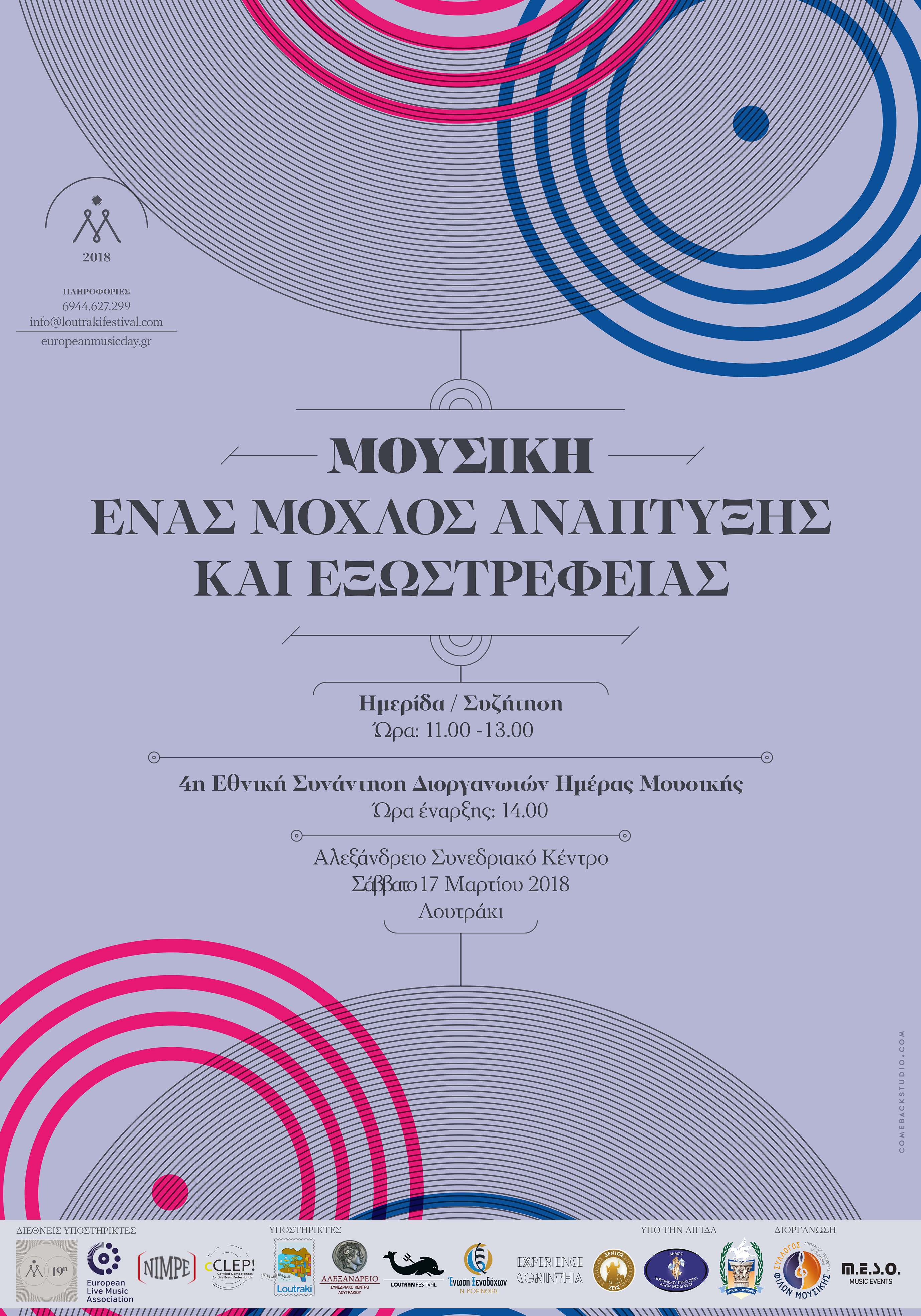 O Σύλλογος Φίλων της Μουσικής και η ΑΜΚΕ Μ.Ε.Σ.Ο. Μουσικές Εκδηλώσεις, στα πλαίσια της 4ης Εθνικής συνάντησης των διοργανωτών του Ελληνικού δικτύου της Ευρωπαϊκής Γιορτής της Μουσικής που θα λάβει χώρα στο Αλεξάνδρειο Συνεδριακό Κέντρο Λουτρακίου στις 17 Μαρτίου 2018, διοργανώνουν ημερίδα με θέμα: «ΜΟΥΣΙΚΗ – ΕΝΑΣ ΜΟΧΛΟΣ ΑΝΑΠΤΥΞΗΣ ΚΑΙ ΕΞΩΣΤΡΕΦΕΙΑΣ».